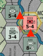 In Step 3, terrain effects are checked, and the odds column is reduced twice: once for the defender being in Moscow, and again because all of the attacking units are across river hexsides. Thus, the new (reduced) odds column for this battle is 1:1.
