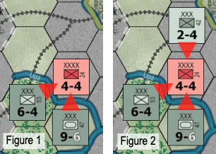 Combat Examples: Here (below) you see two different German attacks on a Russian unit. In Figure 1, the odds begin at 15 to 4, or 3:1. They are reduced one level for the river and another one for the defending unit's fortifications, for final combat odds of 1:1.