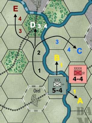 In moving to hex D or E, the German 6th Corps has also spent its entire Movement Allowance for that turn. Note that hex D is a forest hex, and therefore costs two Movement Points to enter (as per the Terrain Effects Chart on the Player Aid Sheet).