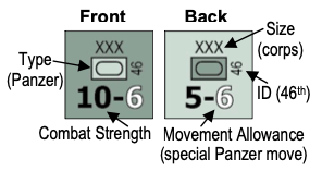 [3.3] The Playing Pieces: The playing pieces represent actual military units that fought in this campaign. The numbers and symbols on the playing pieces represent the strength and type of unit simulated by the particular playing piece. The playing pieces shall henceforth be referred to as "units."